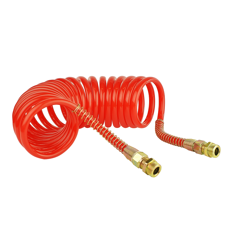 Uniwersalny, czerwony wąż spiralny pneumatyczny (powietrzny), wykonany ze średnio-elastycznego polietylenu,