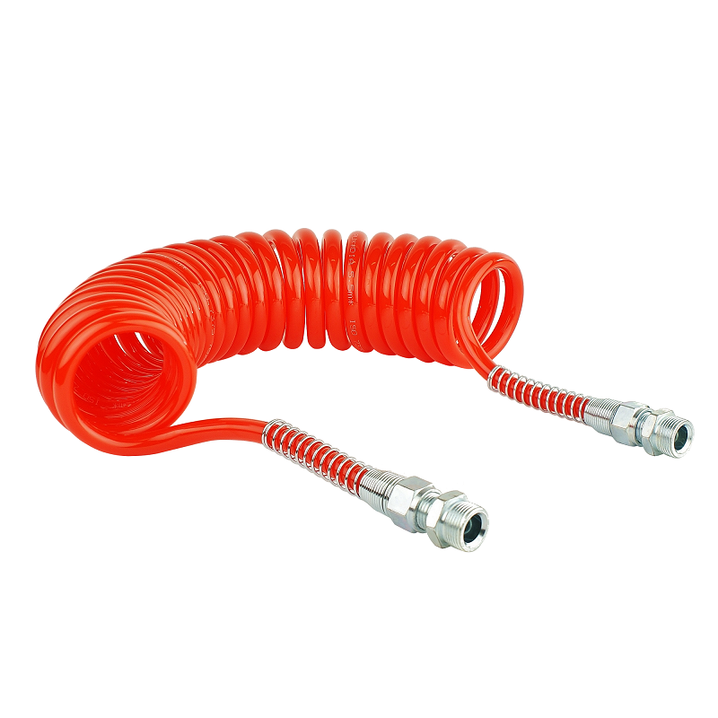 Uniwersalny, czerwony wąż spiralny pneumatyczny (powietrzny), wykonany ze bardzo elastycznego poliuretanu,