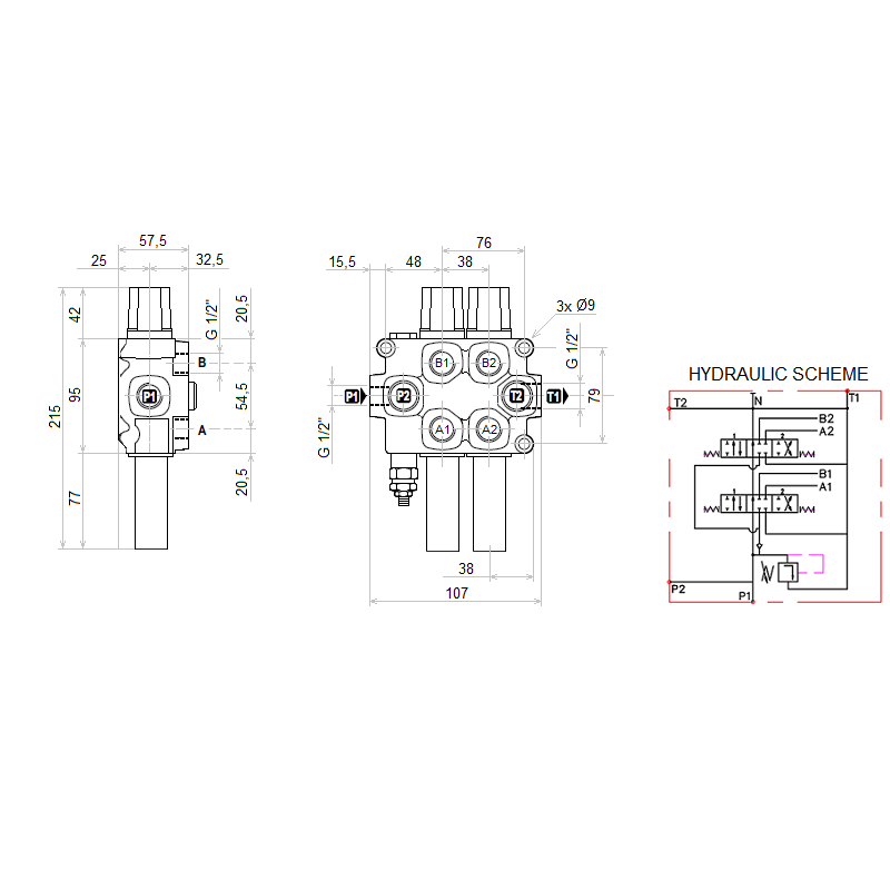 Zestaw hydrauliczny 3 sekcyjny: rozdzielacz 60L + elektrozawór 6/2 + joystick z jednym przyciskiem + dwie linki 1m