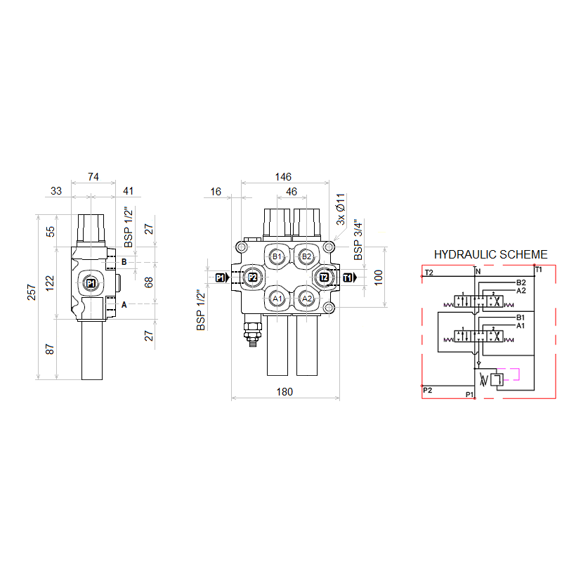 Zestaw hydrauliczny 3 sekcyjny: rozdzielacz 90L + elektrozawór 6/2 + joystick z jednym przyciskiem + dwie linki 1m