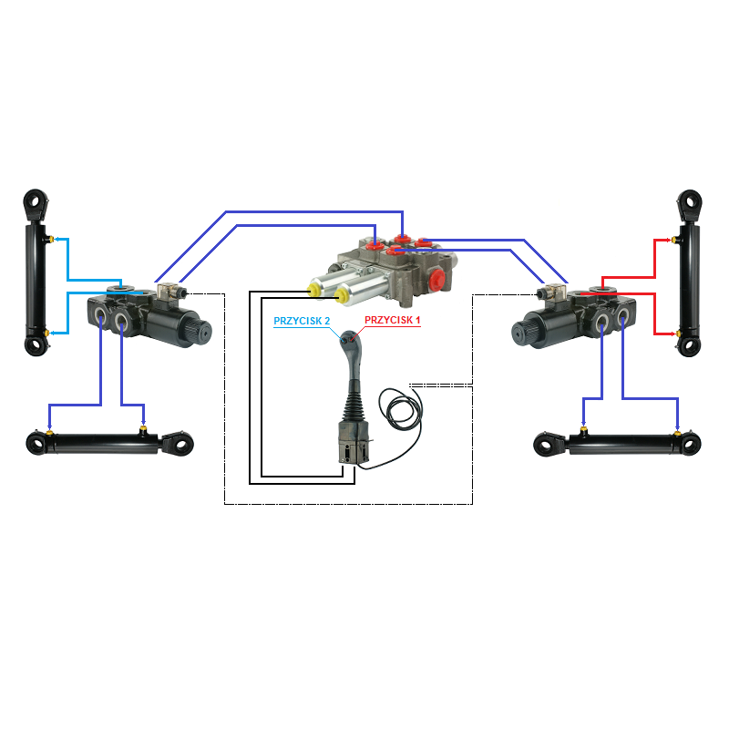 Zestaw hydrauliczny 4 sekcyjny: rozdzielacz 120L + dwa elektrozawory 6/2 + joystick z dwoma przyciskami + dwie linki 1,5m