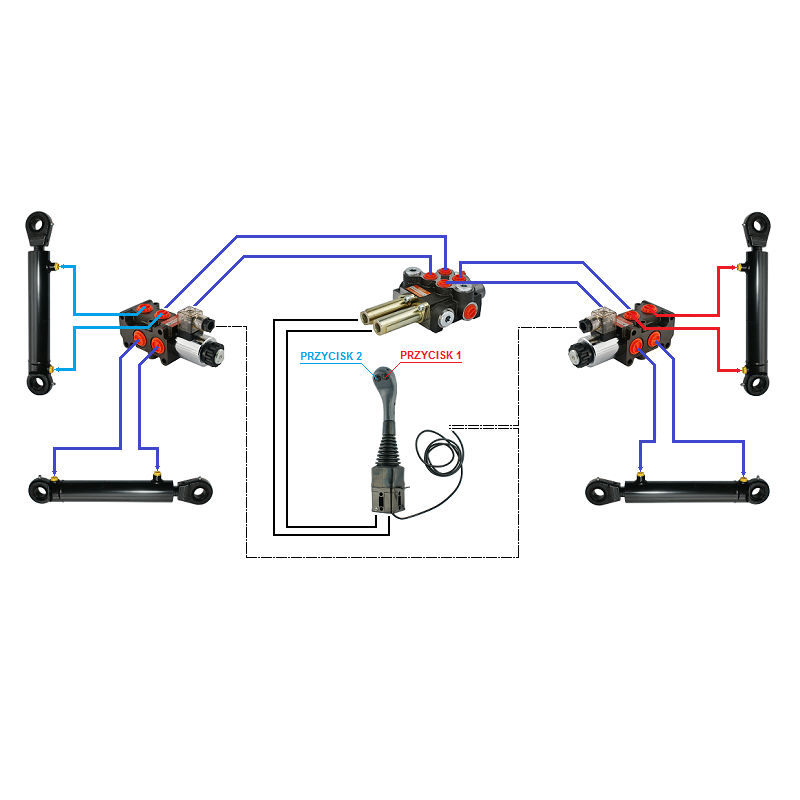 Zestaw hydrauliczny 4 sekcyjny: rozdzielacz 40L z sekcją pływającą + dwa elektrozawory 6/2 + joystick z dwoma przyciskami + dwie linki 1m