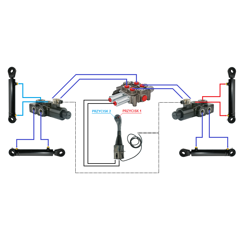 Zestaw hydrauliczny 4 sekcyjny: rozdzielacz 90L z sekcją pływającą + dwa elektrozawory 6/2 + joystick z dwoma przyciskami + dwie linki 1,5m